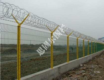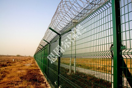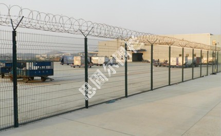 :如果在飛機場圍欄頂部加裝刀片刺絲、刀片刺繩后又很好的增強了安全防護性能。采用電鍍、熱鍍、噴塑、浸塑等防腐形式,具有很好的抗老化、抗曬、耐候等特點。其產(chǎn)品造型美觀、花色多樣,既起到圍欄作用,又起到美化作用。由于具有安全性高、防攀爬能力好,網(wǎng)片連接方式采用特制SBS緊扣件,有效防止人為的破壞性拆卸,橫向四道折彎加強筋,使網(wǎng)面強度顯著增加。