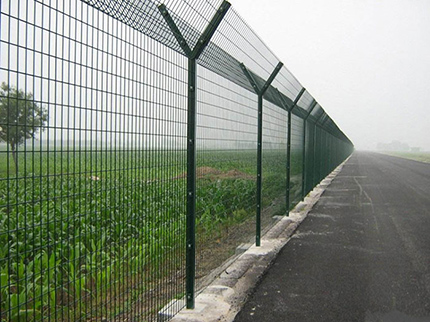 飛行區(qū)鋼筋網(wǎng)圍界網(wǎng)面是由直徑5mm的鋼筋排列成矩形網(wǎng)格點(diǎn)焊形成,相鄰橫筋間距不大于10cm,相鄰豎筋間距不大于5cm.每片鋼筋網(wǎng)片寬度不大于3m,用螺栓固定在事先埋設(shè)好的立柱上.為增加圍界的穩(wěn)定性,一般每30m左右增加一個(gè)斜撐.圍界上部50—60cm以30.一45.角向外傾斜,或設(shè)置滾筒形刺鐵絲網(wǎng)防止攀越。